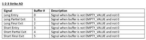 The indicator for our case study, '1-2-3 Strike AO', has two color index buffers to signal partial exit, with buffer 1 for long partial exit and buffer 4 for short. The indicator outputs a non-null value when exit should happen. The EMPTY_VALUE mentioned is a special value MetaTrader uses when buffer is not signalling, also 0 is quite common as well. Indicator specifications supplied by the developer are as follows: