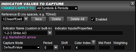 Begin by capturing the color index buffers for the partial exit, with separate entries in CONFIG | Indicator Values to Capture for long/buy and short/sell, as follows. Note, the use DefaultValue capture mode to capture raw value and Weighting set to blank so doesn't interferer with regular entry/exit.