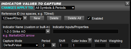 Here we've referenced the captured raw indicator values using an expression {t.buySell} that returns buy if buy/long trade and sell if sell/short trade, i.e. will access 123saoPEbuy or 123saoPEsell indicator reference IDs, as appropriate. Note, i. means access indicator reference ID. We've then checked if not 0 and not EMPTY_VALUE (which is provided by the expression k.emptyValue), as per indicator specifications (shame it's asking us to check for both). Finally, we've issued the command FORCE_CLOSE to do a partial close by 50%, which can be changed by altering the 50 value.